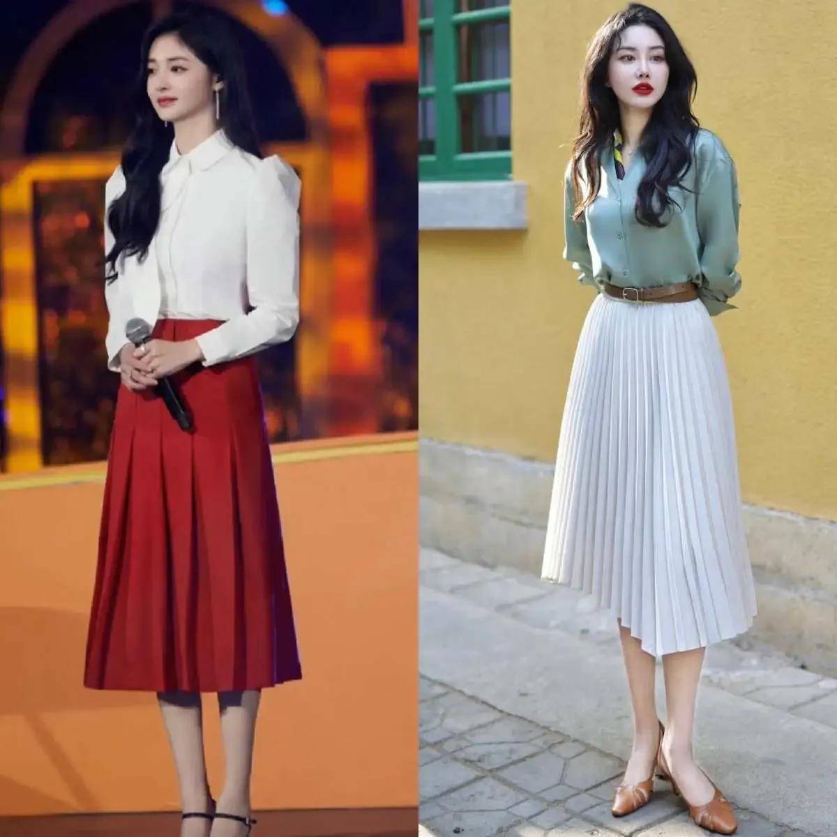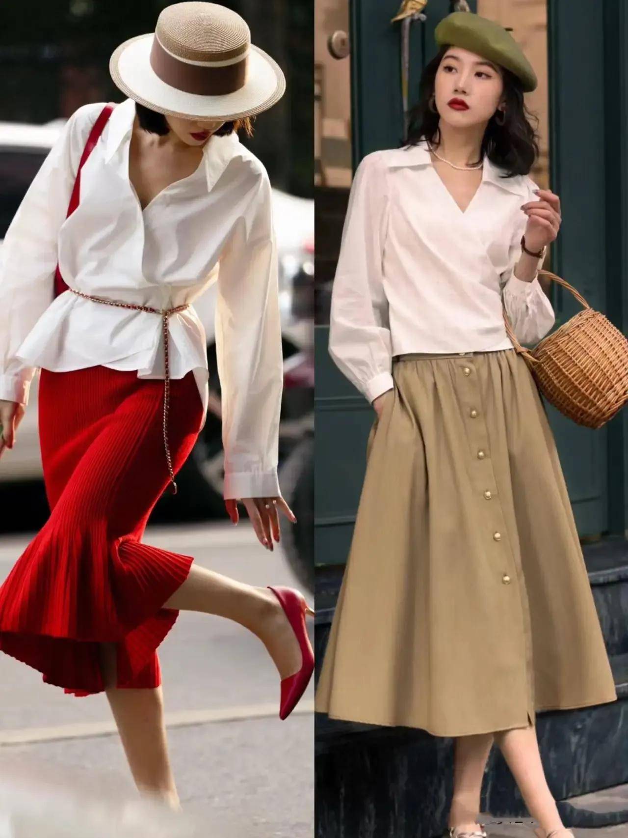 對於中年女性,我個人還蠻推薦選擇白褶半身裙的,略有下面用一件襯衫搭配上百褶半身裙,這樣的穿衣造型比較有量感,整體的穿衣打扮比較遮肉顯瘦。