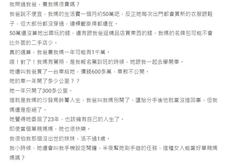 「沒算她出國玩的錢,還有跟我爸逛精品店買東西,真的通算,我爸養我媽一年可能有1千萬。」然而,原PO父親選擇原諒,只要墮胎分手就當沒這回事,但媽媽拒絕了...原PO最擔心的,其實是未出世的妹妹,她清醒地認為,媽媽離開這個家後,絕對無法當個稱職的母親。