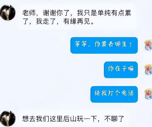 老師頓時意識到不對勁,急勸他不要做傻事,有什麼事都可以說,沒有什麼事情是不能解決的,讓他先給自己打個電話。