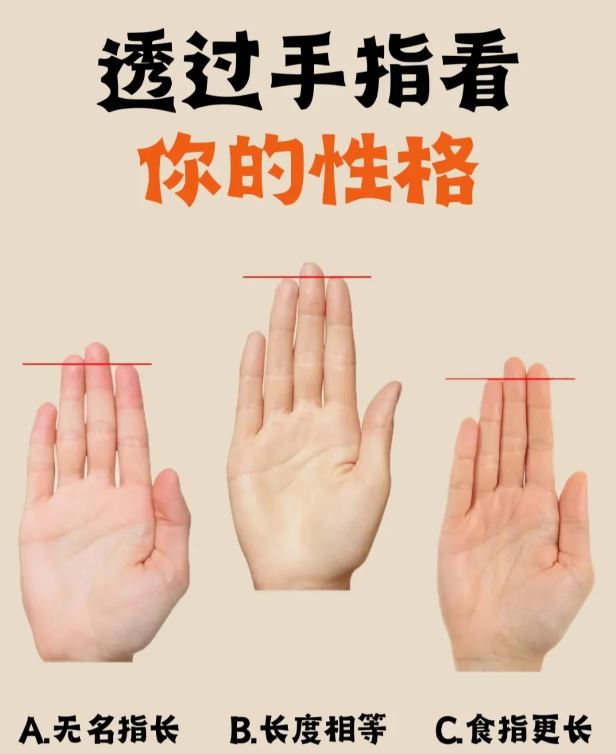 今天想和大家玩一個神準的心理測驗!比起複雜的看手相,下面這個小測驗,只需要把手掌攤平、五指併攏,看看你的食指和無名指、哪個比較長,就能一眼洞察你這個人的性格唷~小編覺得蠻準的,一起玩玩看吧。