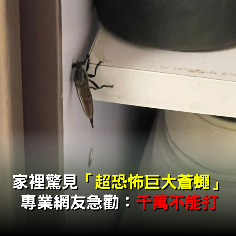 近期一位香港網友就遇到了讓他嚇到不行的情況!他在臉書社團《香港滅蟲關注組》中PO出兩張照片,畫面中是一隻形似蒼蠅,但卻體型非常巨大的飛蟲,牠的頭部複眼巨大、有細細長長像蒼蠅的腳,不過翅膀又很大片,腹部尾端還尖尖的,有點像大黃蜂。