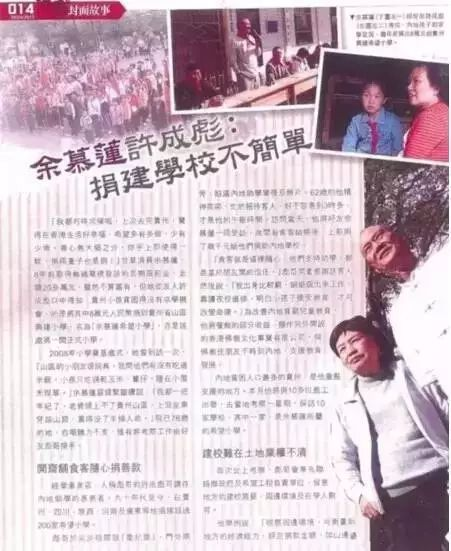 捐了所小學,但余慕蓮從沒有四處炫耀,直到2008年才被TVB得知,邀請她拍攝紀錄片《向世界出發》