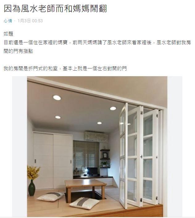 據《ctwant》報導,原PO房間是拆門式和室,平常出入都是左右對開「因為對到父母房門,叫我要改地方出入。」風水老師建議,最好避開階梯,改走其他地方,但原PO前陣子才因此跌倒,加上她上周扭到,到現在走路都隱隱疼痛,醫生要她好好休息、復健。