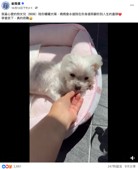崔佩儀19日證實馬爾濟斯愛犬離世,在臉書難過發文:「我最親愛的狗女兒(妹妹),謝謝妳帶給我們全家10年多的歡樂,妳永遠活在我們心中。」願「妹妹」擺脫病痛,到天上去當個開心的小天使,盼她一路好走,貝克宇也在限時動態向愛犬告別。