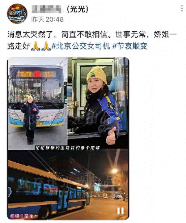 17日,一位攝影創作者「光光」發布了一條動態,悲痛告知他認識的一位公車司機「嬌姐」不幸去世了,聽到消息他簡直不敢相信,希望嬌姐一路走好。