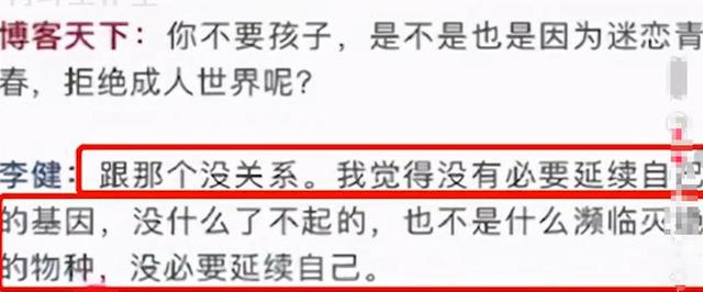 早在2020年,就有媒體就網路上的輿論採訪李健,想知道他為什麼要和妻子選擇丁克,卻不想李健回答「還沒有準備好」、「自己也不是什麼瀕危物種,沒必要延續自己的基因」。