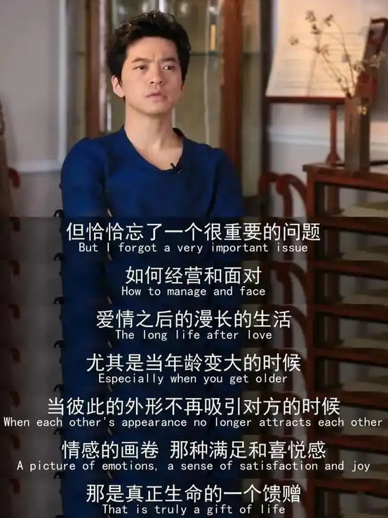 「一個很重要的問題是,如何經營和面對愛情之後的漫長生活,尤其是當年齡變大之後,當彼此的外形不再吸引對方,情感的畫卷,那種滿足和喜悅感,那是生命真正的饋贈。」