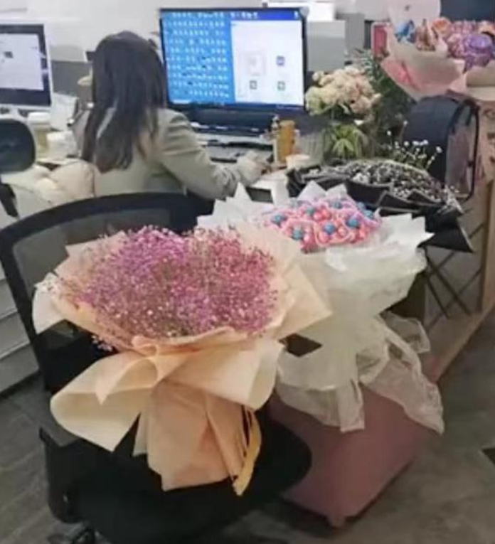 在媒體的報導下得知這名女子來自中國陝西,據說這女子在情人節前夕,就開始收到來自不同地方寄來的巧克力、禮物、櫻桃款與鮮花款花束等,由於這些東西都寄到公司,所以女子也只能先堆在座位旁,這樣的情形就讓她本身的位置變成「擺滿禮物山」的模樣,任誰看了都會好奇怎麼做到的。