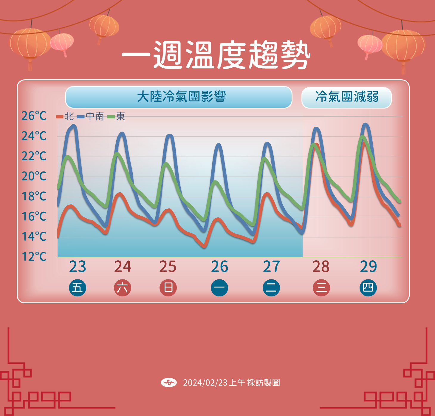 冷氣團提早達標!下周低溫跌破10度「最凍2天時間出爐」 一路冷到2月底 Cara 2024-02-23 檢舉 圖片來源:ETtoday周六和周日,中部以北低溫13到14度,其他地方16到18度,周日和下周一冷空氣會再補充下來,中部以北氣溫會再更下降,下周一前後北部、中部低溫可能會到11到14度,下周三開始水氣減少,降雨縮減為迎風面基隆海岸、東半部、大台北地區,逐漸回到乾冷天氣。圖片來源:氣象局資料來源EToday Advertisements 回首頁 2/2 Advertisements 編輯精選推薦 More + 24歲兒失明!于美人爆「他在飯店掃廁所」維生 不盼紅包只求「別再花我的錢」 85歲失智父身亡!林葉亭突宣布「皈依佛門」 遇大師「開示一番話」忍不住淚崩 台海若開戰「哪縣市最安全?」 網狂推2地:「打都不會打」 趕在40歲前閃婚!八點檔女星「宣布嫁給他」 尪驚人身分曝「媒人是柯叔元」 台語歌后慟別摯愛!告別式上認「早隱瞞病情」 道歉哭喊:原諒我簽放棄急救 以為只是小感冒!本土女星悲痛證實「他併發肺炎過世」 一度淚灑現場「後悔同意插管」 快訊/才過1年!賴佩霞驚傳「他不幸身亡」急飛美國奔喪 臨終前「女兒陪在身旁」 空窗多年!68歲陳美鳳突羞認「身邊有個他」 40年前就認識「遭男方母親拆散」 相差18歲!58歲康康自爆「與老婆分房12年」驚呆眾人 提到沈玉琳「坦言罹同1病」:必須警惕... 慘遭飛車拖行!八點檔男星「臉全磨爛」驚悚畫面曝 目睹女星「崩潰嚇哭」頻發抖 22歲愛女病逝!資深男星「走不出喪女痛」留白長髮現身 掛骨灰項鍊「代女做1事」惹淚 全遣送中國!台灣873名詐騙犯慘了「外交部出面回應」 婚變尪落跑!單親媽「獨扛千萬債養孩」到處躲黑道 「一開口驚艷眾人」熬成台灣歌后 佛門前不清淨!中台禪寺爆醜聞「下藥昏迷師弟」逞獸慾8次 「黃安妹妹也在內」廟方回應了 最新/賈靜雯深夜慟曝「她已離世」 淚PO合照喊:真的好愛你... 男子突發腦出血走了!醫生怒斥:「吃降壓藥時候,沒有注意這3點!」 快訊/曾叱吒政壇!蔡英文「最信任的她過世」 死訊被證實「已舉辦告別式」 功德圓滿了!台語歌后「悲曝他離世」享壽95歲 淚喊:去當快樂的神仙吧... 快養不起小孩!本土男星「開計程車、斜槓房仲」 突宣布「離開台灣」:演藝圈沒工作 15歲兒「睡夢中離世」!本土女星「送愛子火化」求做1事 「PO照圓滿了」:媽媽和你永不分開 65歲男星獨居暴斃!大咖女星放下恩怨「送前夫最後一程」 昔遭動手6年嘆「死者為大」 離婚11年!洪榮宏愛女結婚「終破冰前妻」 「2爸爸牽她進場」催淚畫面曝 台灣大咖病逝「享壽83歲」!周遊告別式痛哭「認婚內出軌」:兒子很恨我... 本土劇女星生了!7年前凍卵「終於來到我身邊」 歌手尪嗨喊:生個足球隊 曾比江蕙紅!台語歌后「爆未婚生子」遭指指點點 「2次手術害癱瘓」72歲近況曝