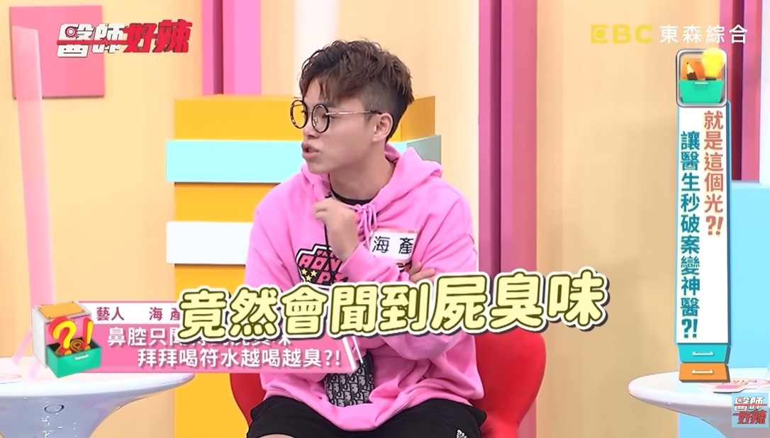 海產透露自己只要感冒就很容易流鼻血,久而久之「一流血就聞到腐爛的味道」,崩潰的他問了身邊的朋友,大家都說沒有聞到,讓他不禁懷疑是不是自己卡到陰?會有這樣的想法,源自於他出身在非常傳統跟保守的家庭,當時阿嬤聽到他的情況後,二話不說就帶他去廟宇給住持看,沒想到對方一見到他就說:「你卡到了,卡很深。」緊接著對他吐滿臉的酒水,還要他照三餐喝香灰水來化解。