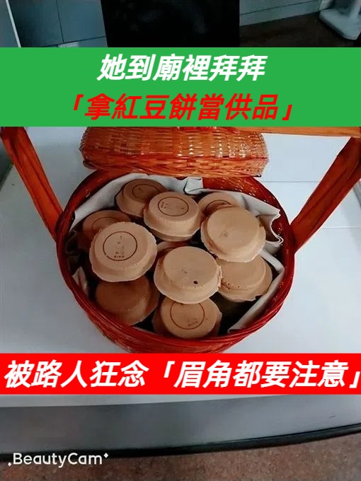 據《TVBS》報導,日前有網友到廟宇裡面拜拜,買了一些紅豆餅都做供品,想要孝敬神明,沒想到其它路人經過的時候,看到祭品籃子裡面,竟然擺放著紅豆餅,就不斷搖頭開始碎念,讓她根本不知道自己做了什麼,於是就拍下照片上網抱怨。
