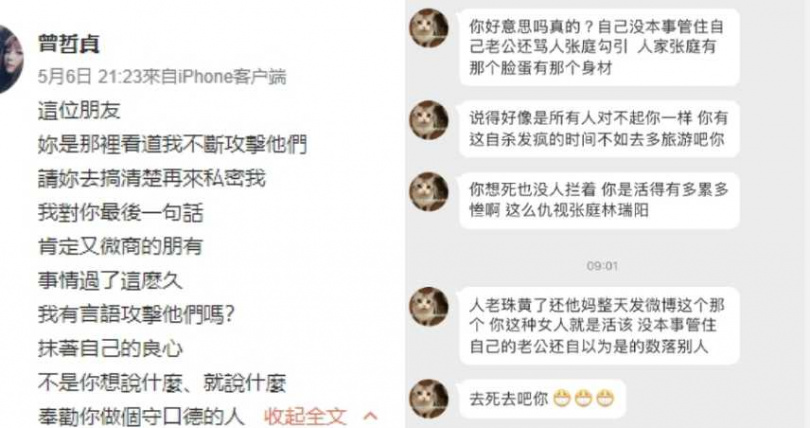 然而,一向低調行事的曾哲貞,卻收到網友私訊批評,對方相當不友善地表示:「你真的好意思嗎?自己沒本事管住自己老公還罵張庭,人家張庭有臉蛋有身材。」甚至直言:「說得好像所有人對不起你一樣」,要曾哲貞有閒時間不如去旅行。這一番話讓她非常不高興,也罕見針對此事做出回覆。