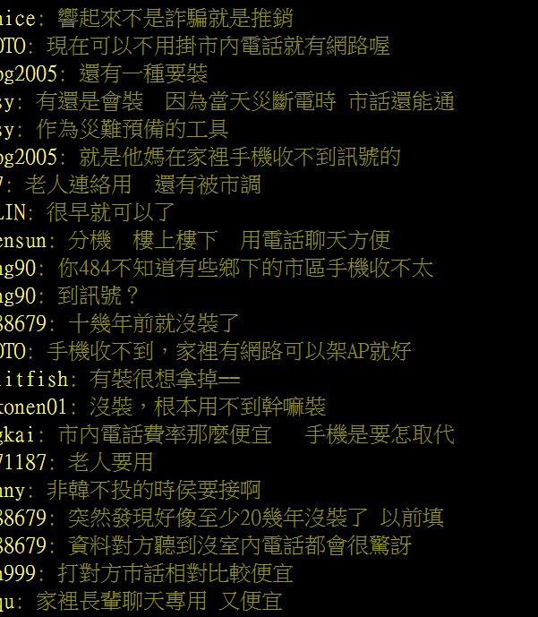 在這個人手一機的時代,許多免費通訊軟體推陳出新,連小編也很少打電話,還會有人願意裝市話嗎?一位網友在網路論壇「批踢踢」詢問,一般住家有裝市內電話嗎?「本宅家中網路走XX電信好多年了,當初搭市內電話門號,就一直沿用到現在...」