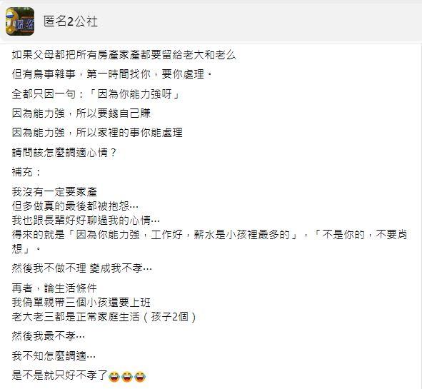 貼文一出,底下網友也紛紛回應:「不孝了, 你才會笑」、「柿子挑軟的吃,你自己要先處理跟打理好自己的生活然後再去跟家人相處」、「寧願不孝,也別愚孝」、「家中總有一個像你這樣勞心勞力的兄弟姐妹」、「既然都被說不孝,不如就坐實它吧」、「老二的悲哀就是如此」、「你自己也放不下父母才會變成這樣。真的不平衡不甘心,父母的要求不要全部答應,拒絕不了那就承受,抱怨只是讓自己難過」。