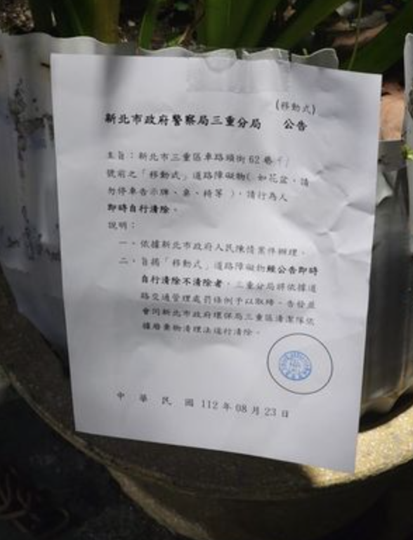 事後,三重分局在接獲舉報後,也於違規處張貼公告,「移動式道路障礙物(如花盆、請勿停車告示牌、桌、椅等),請即時自行清除,經公告不自行清除清除者,將依據道路交通管理處罰條例予以取締、告發並會同環保局三重區清潔隊依據廢棄物清理法進行清除」。網友們看到後,紛紛直呼太過痛快,並分享類似的遭遇,「車子曾被移到馬路正中間被狂叭」、「曾被貼紙條罵難聽話」、「停車曾被鄰居警告會被刺破輪胎」、「曾被連推兩次車收2張違停罰單」。