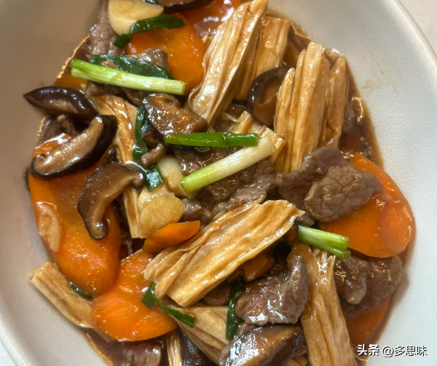 食材:牛肉100g (我選的嫩牛肉的部位)、香菇(新鮮香菇更好,干香菇要提前泡發)7、8個切片、胡蘿蔔半根切片、腐竹100g、小蔥兩根切段
