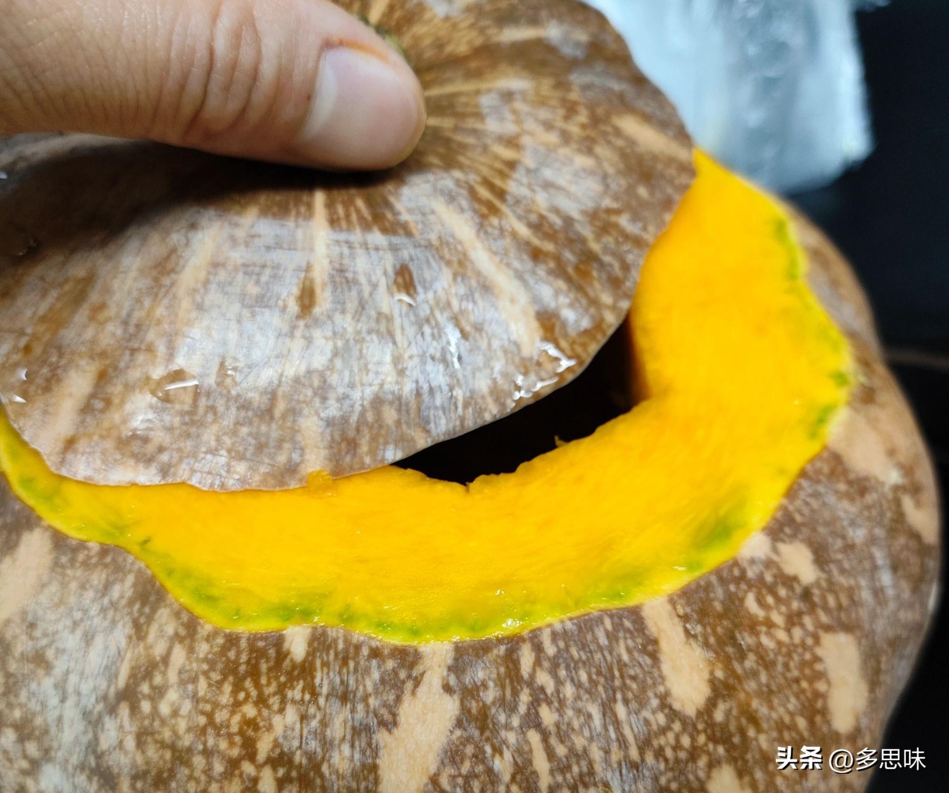 3、蒸米的過程我們先把南瓜洗乾淨,然後用刀把頂部切去一丟丟,用勺子挖出裡面的籽(別扔哦,還可以炒五香南瓜子吃)