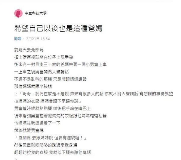 後來,他們剛好在同站下車,小男童的媽媽趁兒子去廁所時,跑過去對她說:「小姐不好意思,小孩剛剛不是故意往妳褲子拉鍊看,小孩子不懂事 希望妳沒有不舒服。」那瞬間,她真的佩服這位媽媽的教養,並再次跟小男童道謝。這時,一旁的爸爸也跟他說:「每個人都會有不小心的時候,有時候小小聲提醒比大聲喧嘩更棒喔!」還不忘稱讚他做得好,姊姊才會跟他說謝謝,並詢問兒子,以後也要小小聲好嗎?