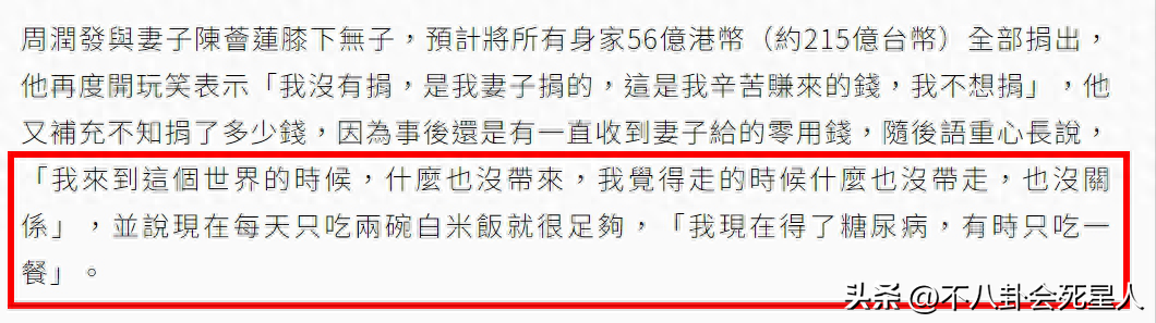去年10月份,周潤發在採訪中透露,自己晚年患有糖尿病,一天只吃兩碗飯就足夠了,有時候一天只吃一頓。