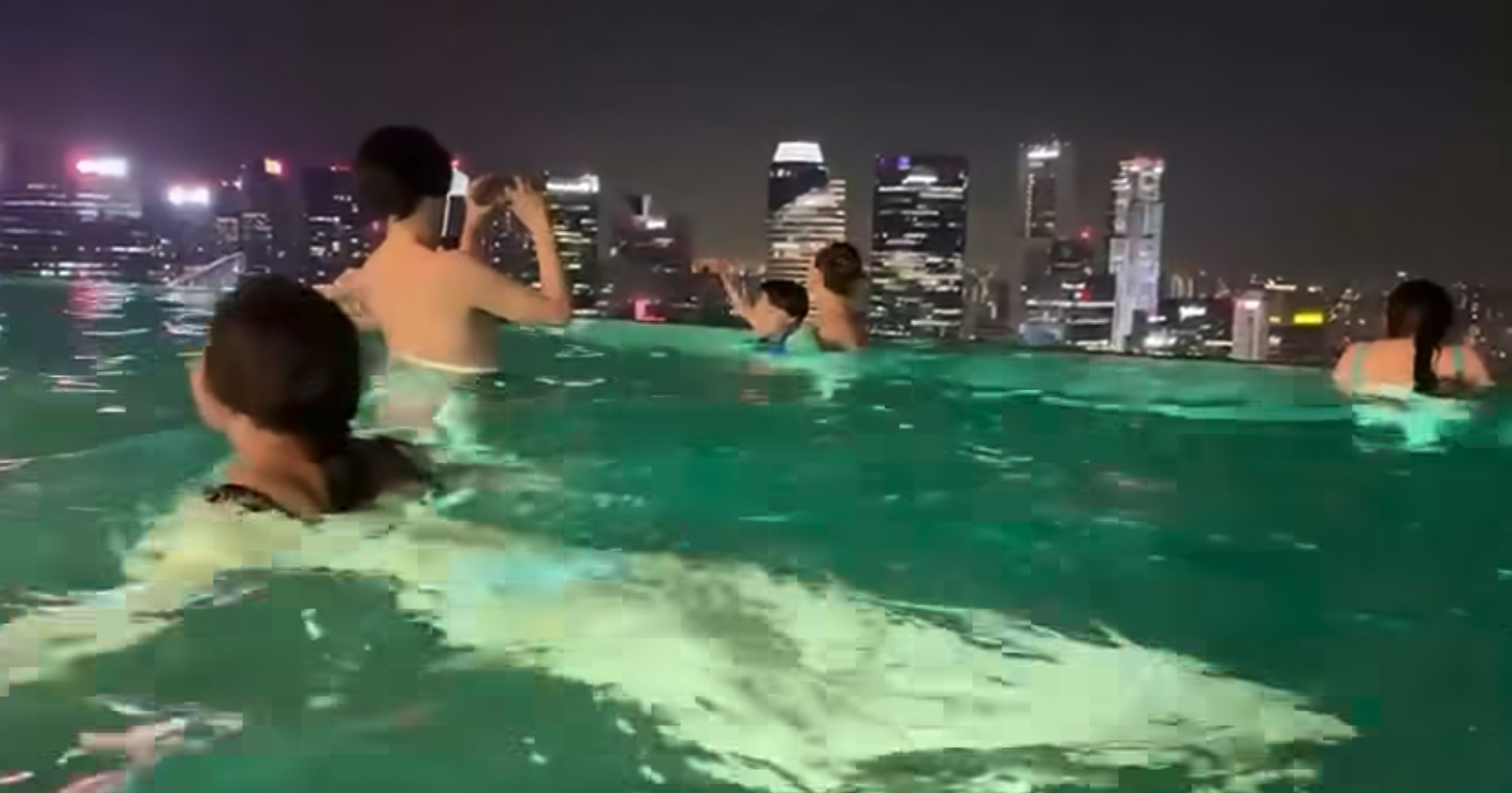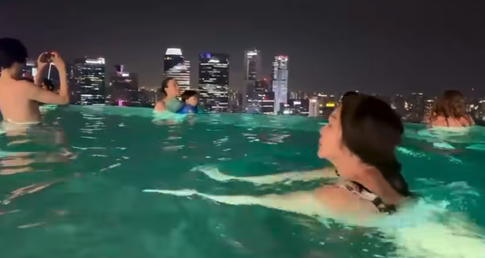 入住濱海灣頂級飯店當然不能錯過無邊際游泳池,陳美鳳換上一襲黑白相間的比基尼,化身美人魚展現優雅泳姿,雖然分享的影片僅有短短9秒,脖子以下也全泡在水中,仍隱約能看到她凹凸有致的火辣身形!