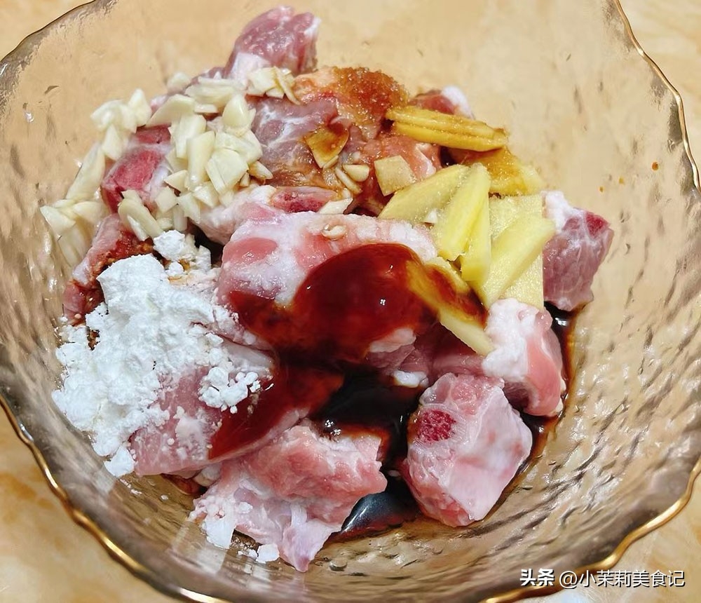 2、排骨中放姜蒜,澱粉,生抽,蚝油,鹽,然後將所有的食材拌勻,裹住每一塊排骨,腌制半小時以上。