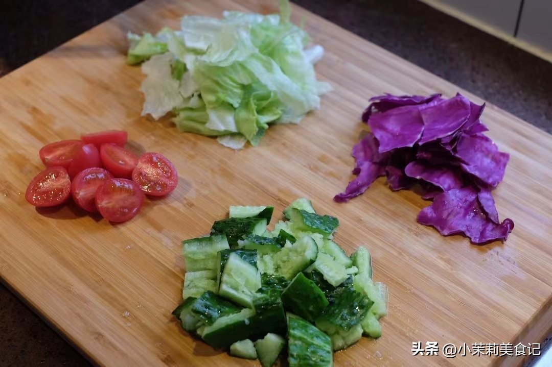 1、適量的圓生菜剝下來,清洗乾淨撕小塊。再搭配兩片紫甘藍,同樣也洗凈撕成小塊。半根黃瓜洗凈拍碎切小塊。兩三個聖女果,洗凈之後對半切開。
