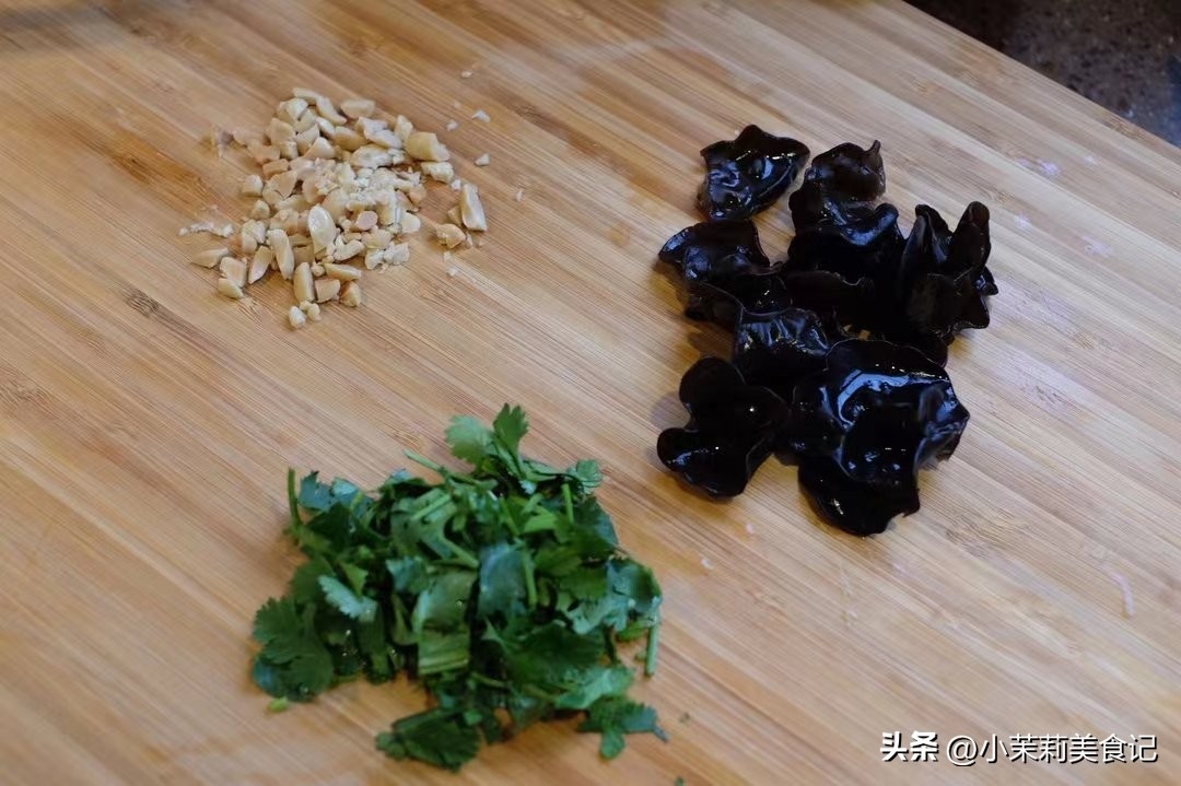 2、提前浸泡幾朵黑木耳,處理乾淨之後在開水中煮3分鐘。一把香菜洗凈切斷,再將幾顆熟花生米壓碎。