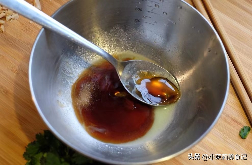 3、調上一個料汁,生抽,蚝油,醋,然後燒一點花椒油趁熱淋進去,進一步拌勻。
