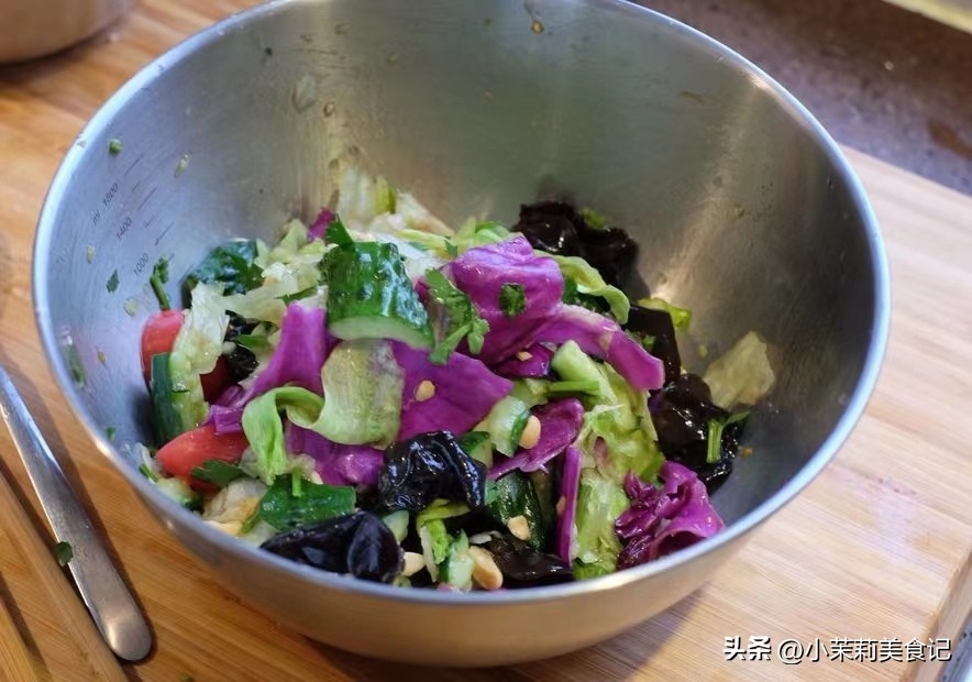 4、最後將全部的食材裝進大盆里,淋入調好的料汁,拌勻入味即可裝盤。