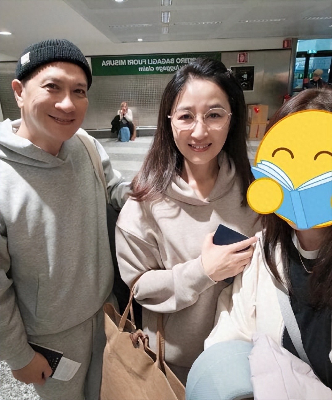 姐姐狀態真好,發量濃密且狀態自然。老公張家輝拿著機票護照站在旁邊,戴著帽子的他狀態也特別好。