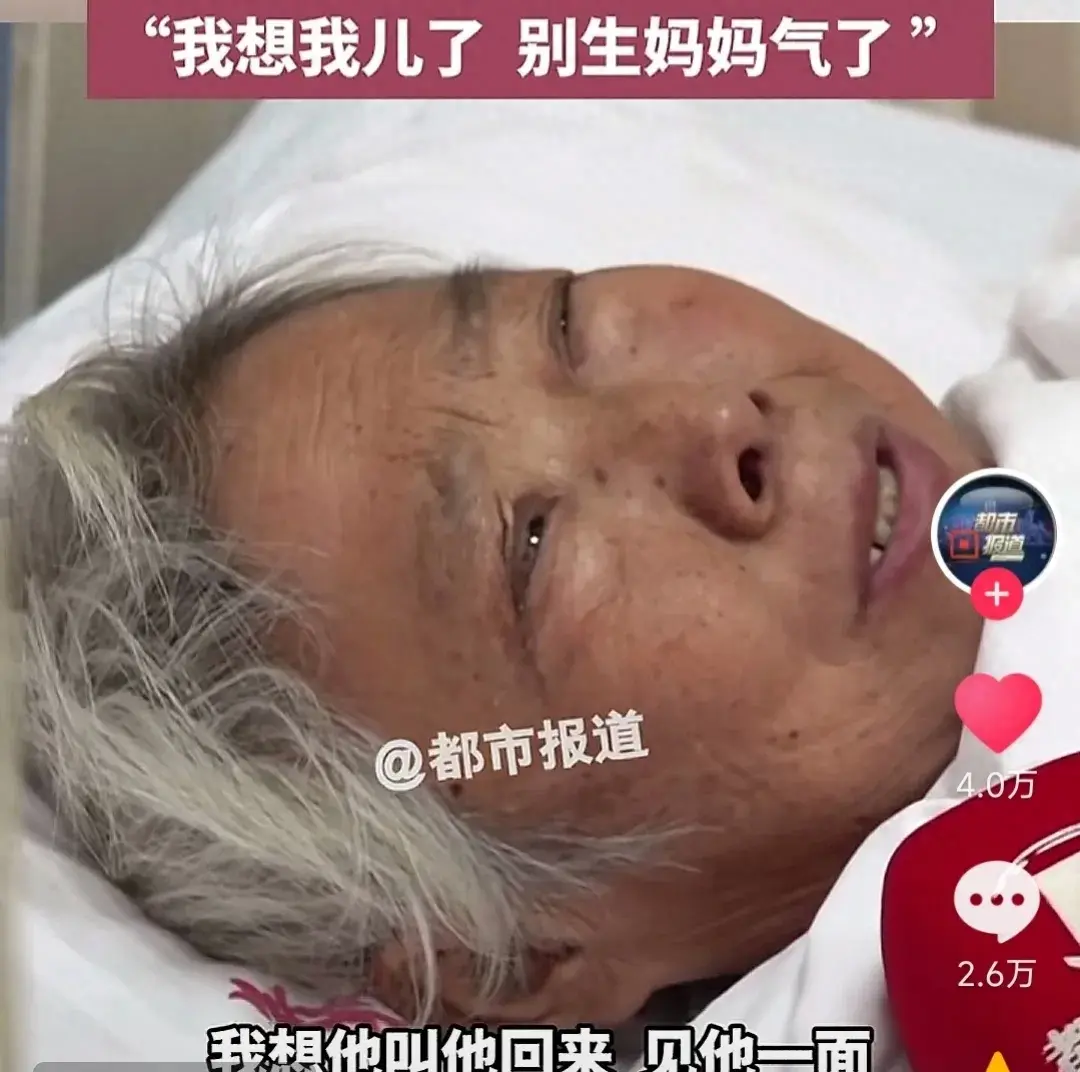 病床上,滿臉皺紋的老太太眼含熱淚,神情悲痛地呼喚著自己的大兒子:
