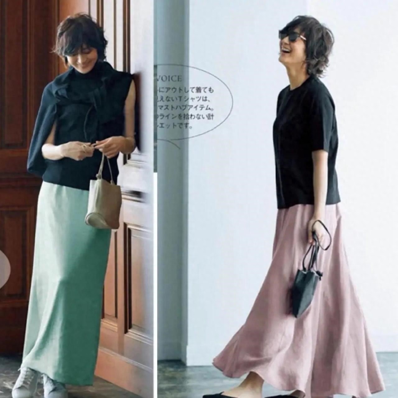 低飽和度的莫蘭迪色,也很值得大家去嘗試,像一些豆綠色、藕粉色、霧霾藍等等,就很適合用於半身長裙當中,再搭配上純黑色的基礎款上衣,不僅特別溫柔大方,而且又可以穿出足夠高級時髦的功效。
