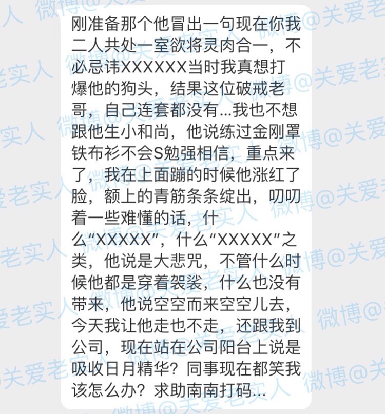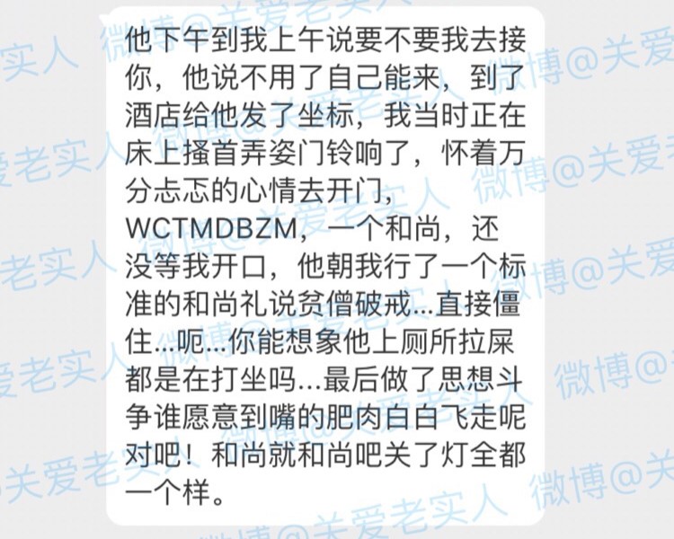 完事後,女網友才發現和尚男友從外地來到她所在的城市,居然身無分文、而且不管何時都穿著那身袈裟,「他說空空而來、空空而去,」接著更讓女網友崩潰的是,「我讓他走也不走,還跟我到公司,站在公司陽台上說是吸收日月精華?同事都在笑我!」