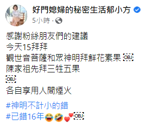 拜錯16年!郁方拜拜「觸1禁忌」被網友糾正小心 隔1個月「再PO佛堂祭拜照」被讚好媳婦