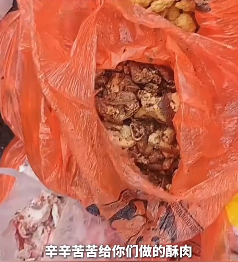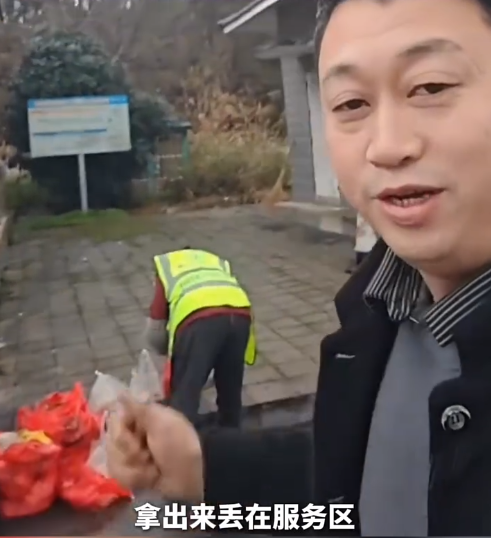 一名男子當場就拍攝了影片,然後一邊指著被丟棄的肉製品一邊譴責;「你不要就不要,拿出來丟在服務區,這是你們父母辛辛苦苦給你們做的酥肉,拿出來丟在垃圾桶邊上,這麼好的東西哎呀,太可惜了。」