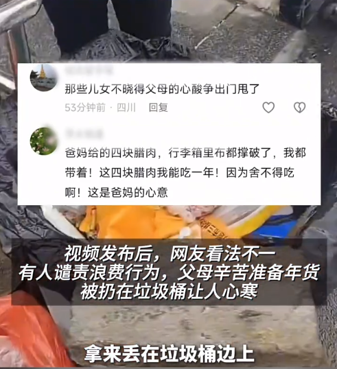 當然,也有一些網友是譴責的態度來批評對方的。四川網友跟帖留言;「那些兒女不曉得父母的心酸爭出門甩了。」還有網友留言;「爸媽給的四塊臘肉,行李箱布都撐破了,我都帶著。這四塊臘肉我能吃一年!因為捨不得吃啊!這是爸媽的心意。」