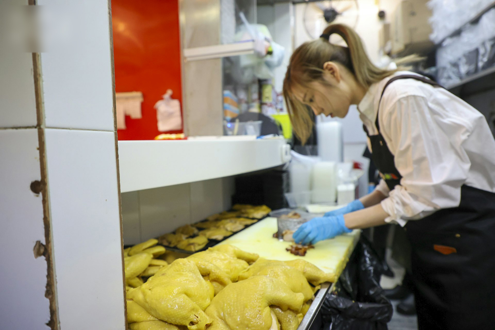 因為餐廳做的是海南雞肉飯,梁茵每天都要切一桌子的雞。