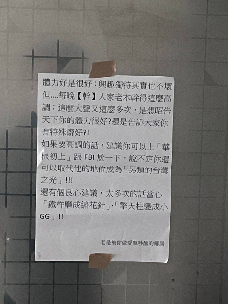 原來,鄰居每到凌晨就開始玩遊戲,邊玩邊罵「X林老木」,越喊越起勁,讓他忍不住寫下:「每晚X人家老木X得這麼高調,這麼大聲又這麼多次,是想昭告天下你體力很好?還是告訴大家你有特殊癖好?!」並建議他去「華根初上」跟FBI尬一下,說不定能成為另類台灣之光!一番言論讓網友笑翻:「蓋管委會的章一定更好笑。」、「擾鄰真的不行~」