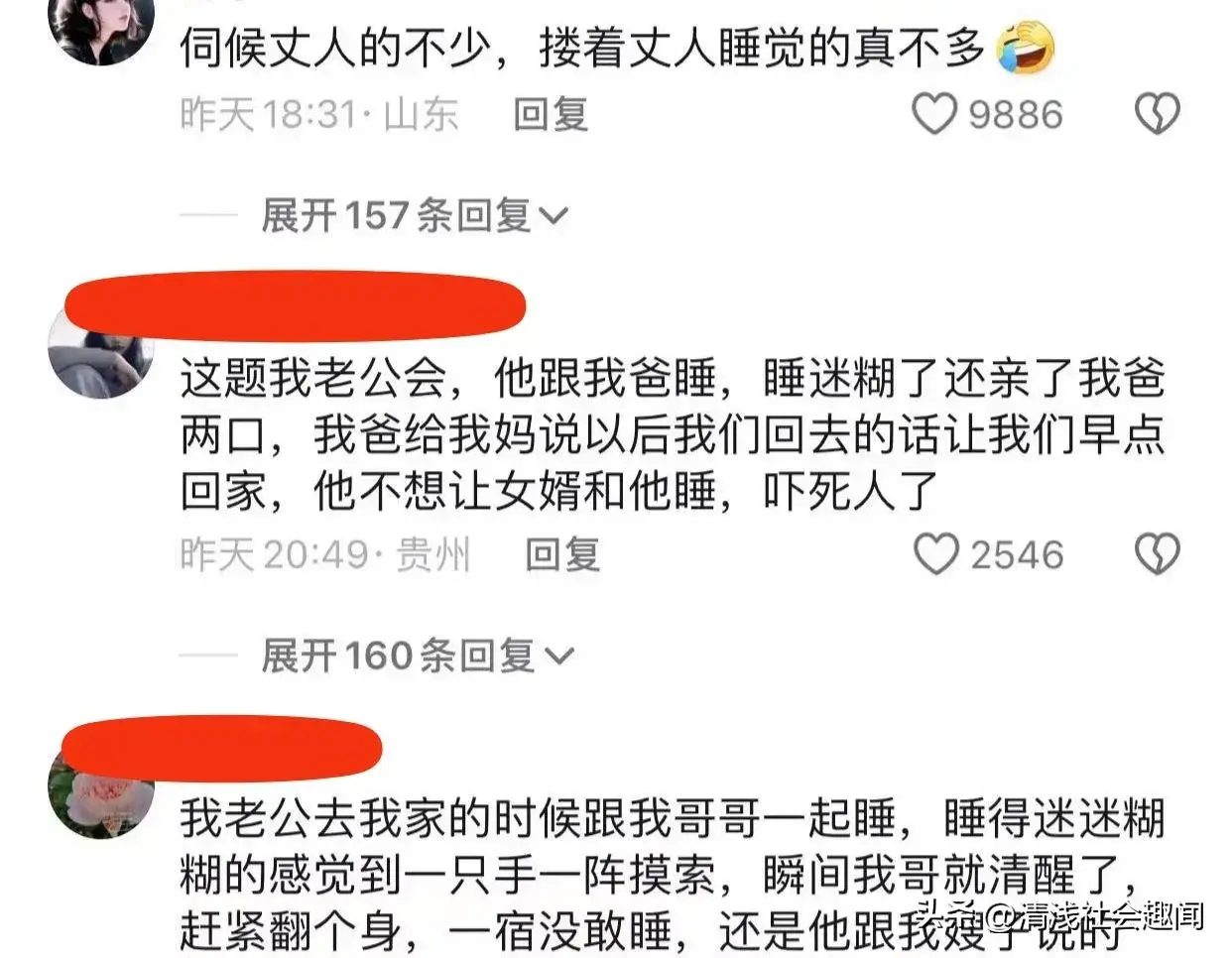 還有網友評論說,這題我老公會,他跟我爸睡,睡迷糊了還親我爸兩口,把我爸整無語了,讓我們以後早點回家,別在娘家睡。
