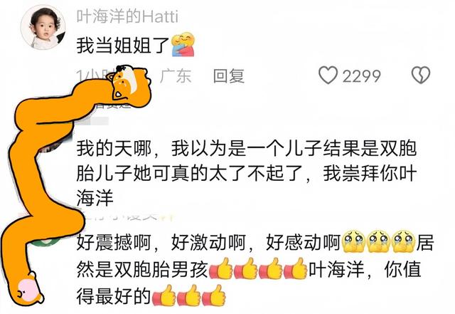 「好震撼啊,好激動啊,好感動啊,居然是雙胞胎男孩,葉海洋,你值得最好的。」