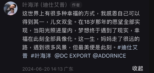 在2024年6月20日,葉海洋在自己的社交平台上發布了一個日常影片,其中葉海洋的大女兒和二女兒快樂地坐在沙發上,手中分別抱著一個洋娃娃,而畫面一轉,卻見兩個女兒滿臉笑容,手中赫然分別都抱著一個可愛的男寶寶!