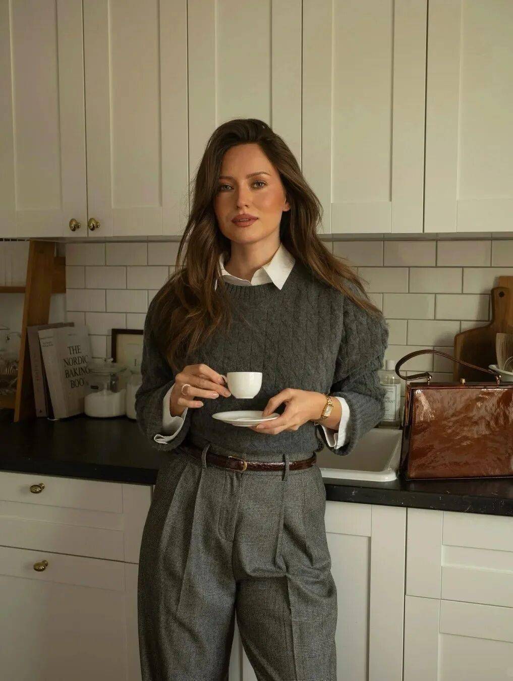 灰色麻花:自信優雅,搭配西裝闊腿褲與咖色腰帶,大氣從容,演繹知性休閑氣場。
