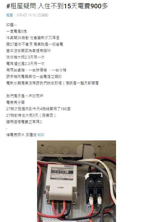 原PO也無奈回覆,租屋格局是一房一廳,冷氣吹的空間不到8坪,通常只開一台,「熱水器我有問房東 他說不會很耗電...」並感謝網友們熱情解答,她會再檢查看看。