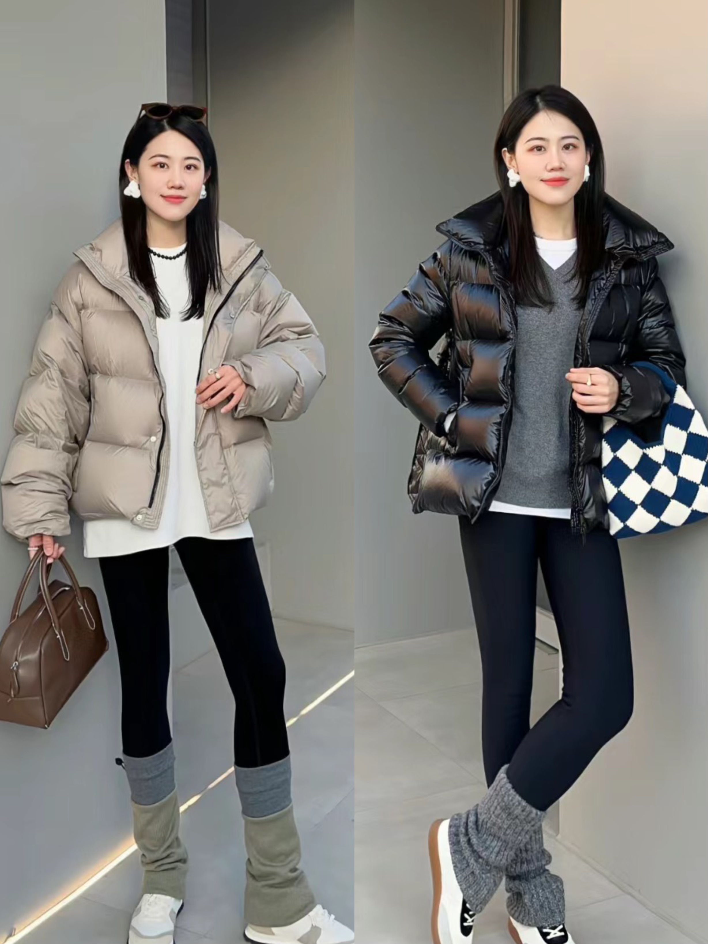 如果想要一種利落大方的美,同時自己的腿型也比較優越的話。我們可以用短款的羽絨服來搭配鯊魚褲。
