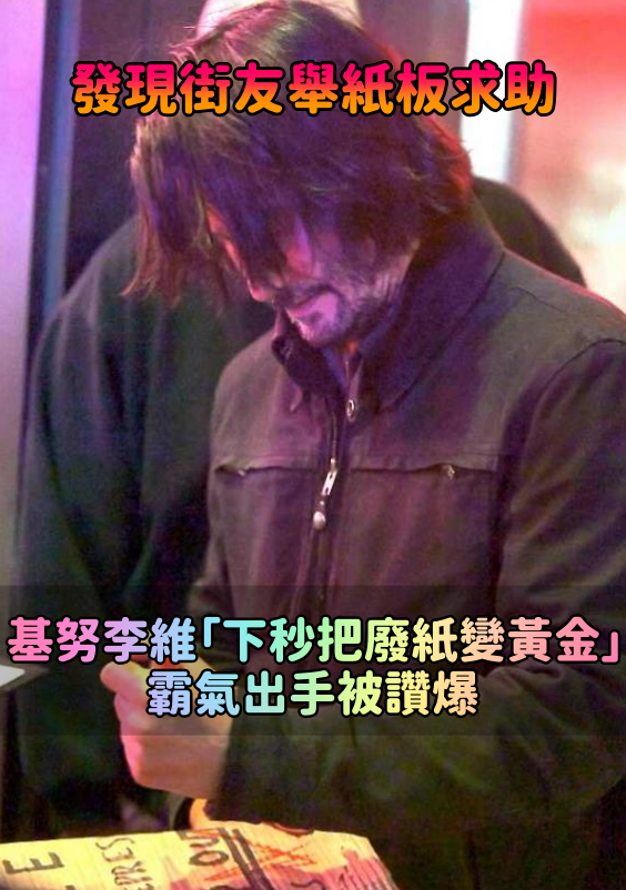 有人目擊基努李維趁著拍片空檔,就和一名街友聊起天來,當他看到對方乞討的紙板上寫著「無家可歸、飢餓、消沉,拜託資助我任何東西,謝謝!」就立刻在上頭用紅筆簽名!