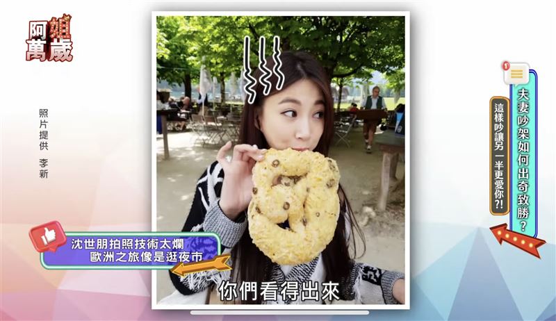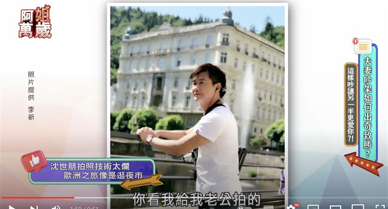 李新也在節目上放出,兩人去歐洲玩的時候,幫老公拍的照片,每一張都帥氣又好看,可是輪到自己的照片時,老公都把自己拍得很奇怪,開玩笑生氣說:「你們看得出來這是同一趟旅行嗎?他去的是歐洲,我去的像是某個夜市!」只是一趟旅行中,不想因為這樣就生氣,常常忍住脾氣,只是最後根本不能忍,兩人就會因此吵架;對此,主持人陳志強就說,兩人應該互相包容,李新應該要懂得欣賞老公的視角。