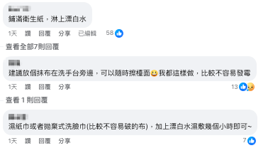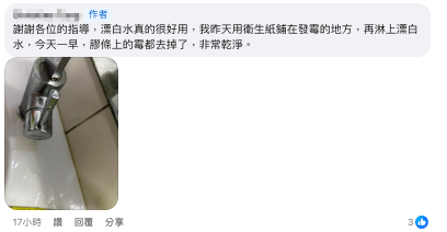 貼文一發出後馬上引起熱烈討論,大部分的人會分享清潔劑好用品牌,但也有內行人大方公開秘訣,靠簡單好物就能大逆轉,紛紛喊話:「鋪滿衛生紙,淋上漂白水」、「濕紙巾或拋棄式洗臉巾,加上漂白水濕敷幾個小時即可」、「濕紙巾噴上漂白水,鋪上等3、4小時,會看到明顯改善。」、「我用花妝棉+漂白水,晚上用,一覺醒來變白的」