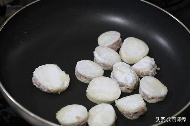 開始把肉餡夾在杏鮑菇內 ,並把口磨平,把夾好的杏鮑菇沾勻粉芡,這樣防止肉末再烹制過程中脫落,這樣肉餡也更滑嫩。