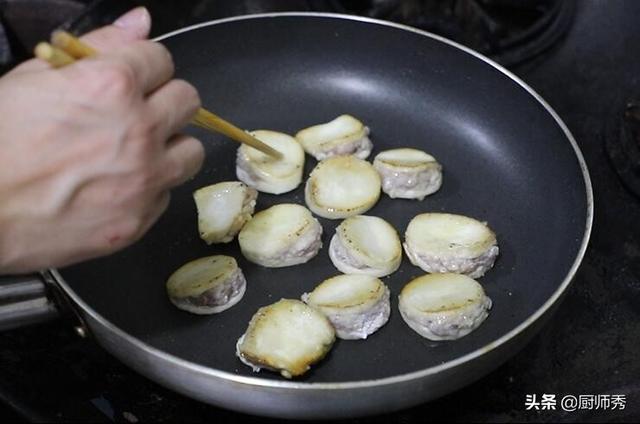 在煎制的時候要晃動下鍋 ,讓杏鮑菇受熱均勻,煎制一面金黃之後,用筷子翻過來煎制另外一面,兩面都金黃之後倒出備用,煎制杏鮑菇的時間大概是3分鐘左右 。