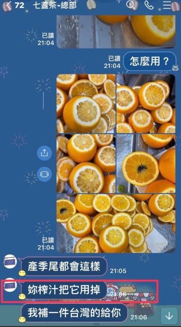 加盟主表示她向總公司反應運送到店的食材全都變質不能用,包括甘蔗原汁臭酸、芒果表皮大量黑班、冷凍芒果退冰出水、柳丁切開內部發黑等問題,沒想到總部窗口竟回覆「產季尾都會這樣,妳榨汁把它用掉。」公司後來雖然告知有問題的原物料可以退換貨,但條件卻十分嚴苛,讓原PO忍不住生氣直呼:「物料問題我們都積極的在詢問總部處理方式,但總部在回覆問題總是推託卸責或是要加盟主自行吸收,或是讓我們找其他方式賣給消費者!」、「希望總部能接受與承認自己的錯誤負起責任,不要再讓其他加盟主在做生意期間,需要自行承擔物料風險!」